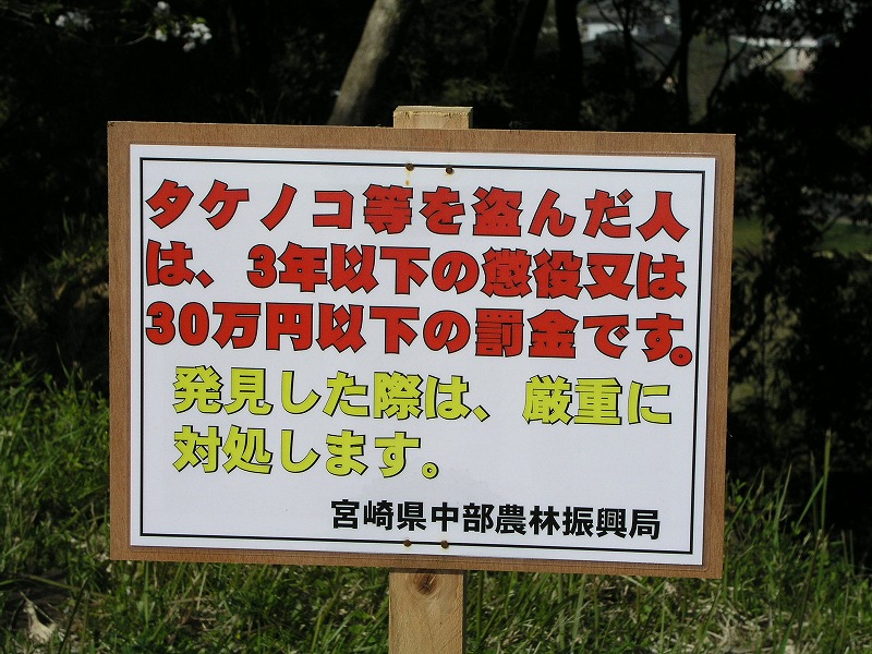 公園内に「泰山竹」(たいさんちく)が群生していて「タケノコ等を盗んだ人は、3年以下の懲役又は30万円以下の罰金です。・発見した厳は、厳重に対処します。」っていう看板がありました。